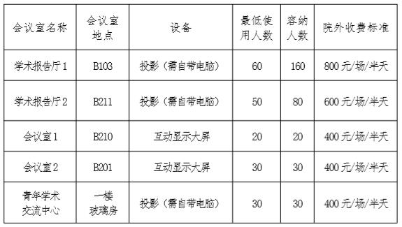 资环学院会议室(报告厅)面向本院师生免费使用,院外团队或个人在不影响本院师生使用的情况下,付费使用。
