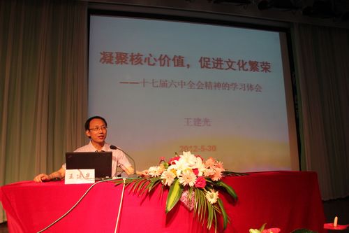 本次讲座深入简出,令人回味。王建光教授从四个方面对十七届六中全会的精神进行了详尽地阐述。首先,结合时代背景,他讲解了文化发展的价值观和意识形态,并就当前文化产品数量多、质量差、缺乏竞争力的现状表达出担忧,强调加强文化建设的紧迫性。接着,王教授在个人和国家两个层面说明建设文化的核心价值与核心竞争力的重要性。他告诉学员,从个人角度,我们应当提升自身的核心价值,与时俱进,坚持正义;从国家角度,中国当代社会正在进行转型以积极应对复杂的国际环境。最后,王教授就如何培育文化消费,创新文化发展,为大家讲解当前中国经济总量大而文化发展落后的现状。培训结束之际,王教授提出了如何创造“中国梦”和贯彻核心价值,大力加强软实力建设的方针政策的问题,引发了学生党员的思考。
