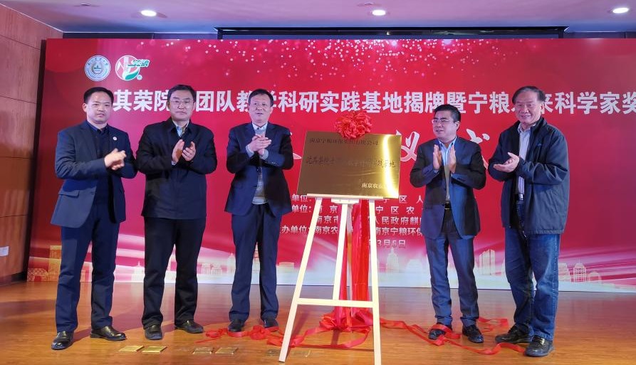 南京宁粮环保集团有限公司梁晓辉董事长、中国工程院院士沈其荣教授、市政府王国夫副秘书长、市农业农村局顾正良副局长、江宁区委张思明副书记共同为“沈其荣院士教学科研实践基地”揭牌。 梁晓辉董事长和沈其荣院士代表双方签订共建协议,梁晓辉董事长和邹建文院长代表双方签订捐赠协议。