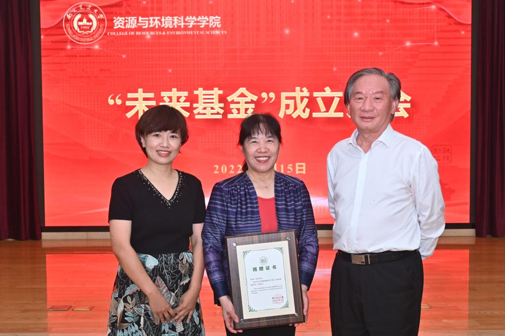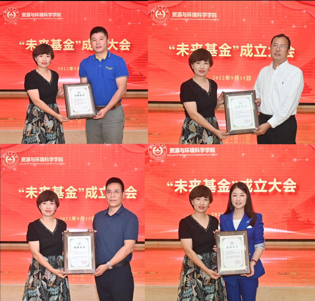 资环学院院长李荣宣读了“未来基金”理事会成员名单。大会还举行了“未来基金”现场捐赠仪式。李荣代表“未来基金会”接受捐赠,校友总会办公室(教育基金会办公室)主任姚科艳向捐赠人颁发了证书。