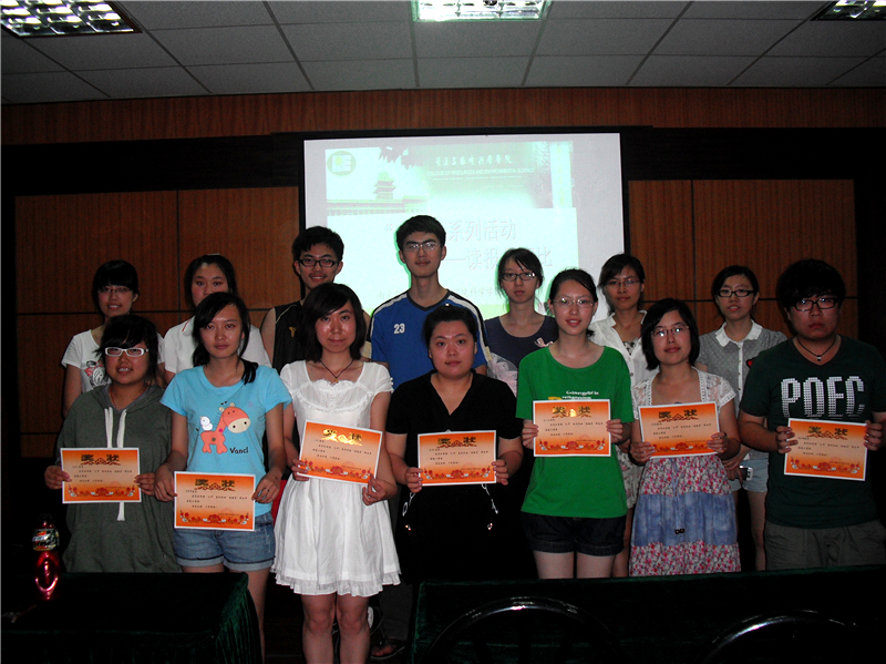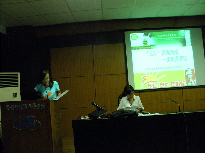 2011年5月20日,资环学院在教学楼B316举行“三早”系列活动——读报员评选活动。本次活动主要面向大一学生展开,获得本次比赛一等奖的选手将在早操前为大家读报。来自资环院学生会六个部的部长担任本次比赛的评委,学生会执行秘书长宋阳主持本次评选活动。