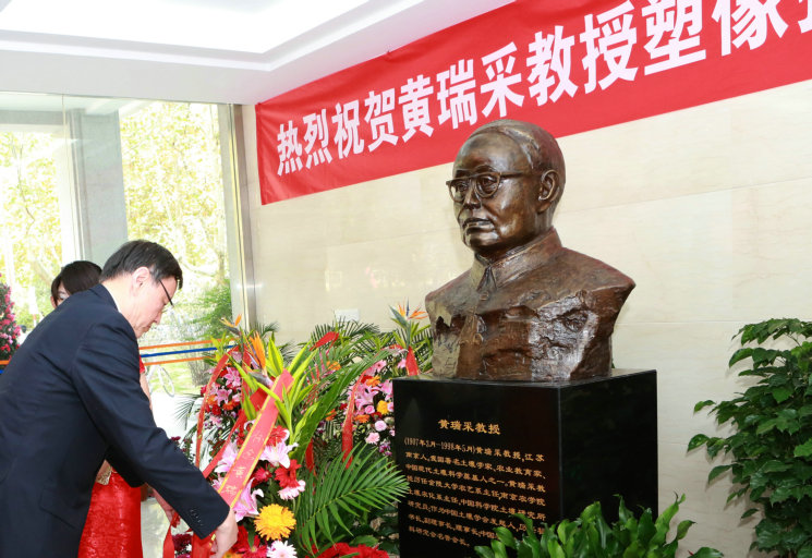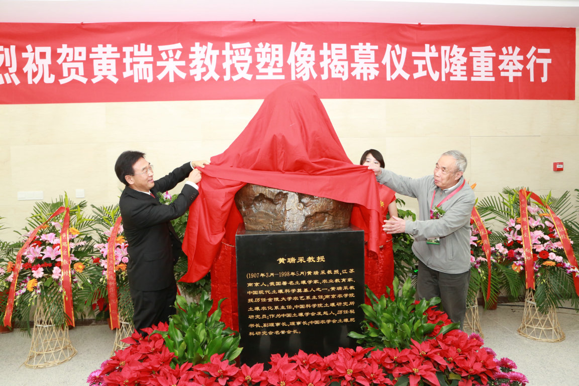 10月20日,我国著名农业教育家、现代土壤学奠基人之一、中国土壤学会第一届理事长黄瑞采教授塑像揭幕仪式在资环楼大厅举行。中国工程院院士蔡道基,农业部副部长张桃林,省政协副主席、中国科学院南京分院院长、原中国土壤学会理事长周建民,“黄瑞采教授奖学金”基金会理事长、江苏省农科院院长严少华,原江苏省委宣传部副部长林敏端,副校长沈其荣、胡锋,黄瑞采教授家属代表,资环学院院友,及师生代表出席了揭幕仪式,仪式由资环学院党委书记李辉信主持。
