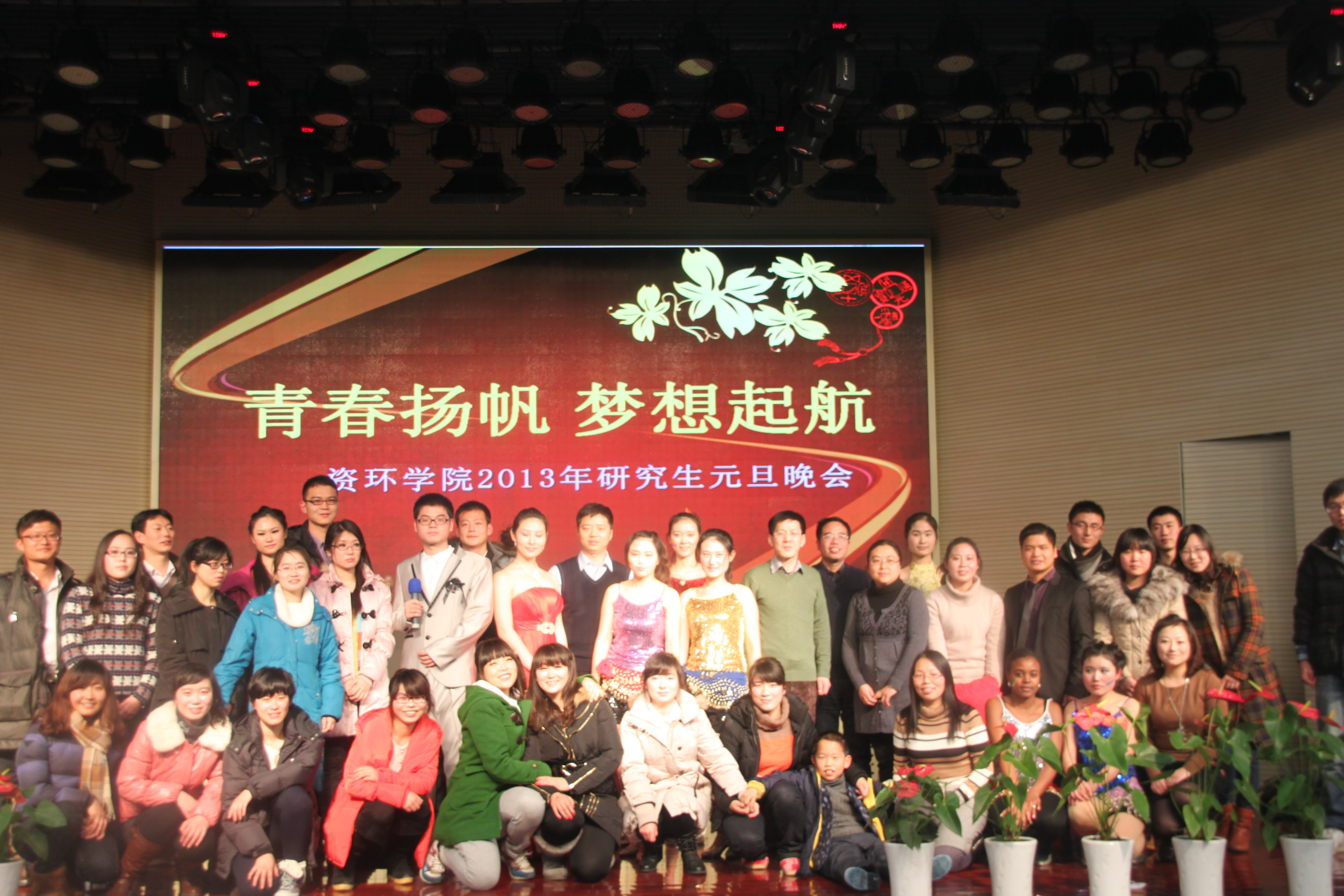 2012年12月27日19点,资环学院“青春扬帆 梦想起航”2013年研究生元旦晚会在大学生活动中心隆重举行。资环学院院长徐国华,院党委副书记崔春红,周立祥教授,熊正琴教授等领导老师与资环学院400多名研究生一同观看了晚会。