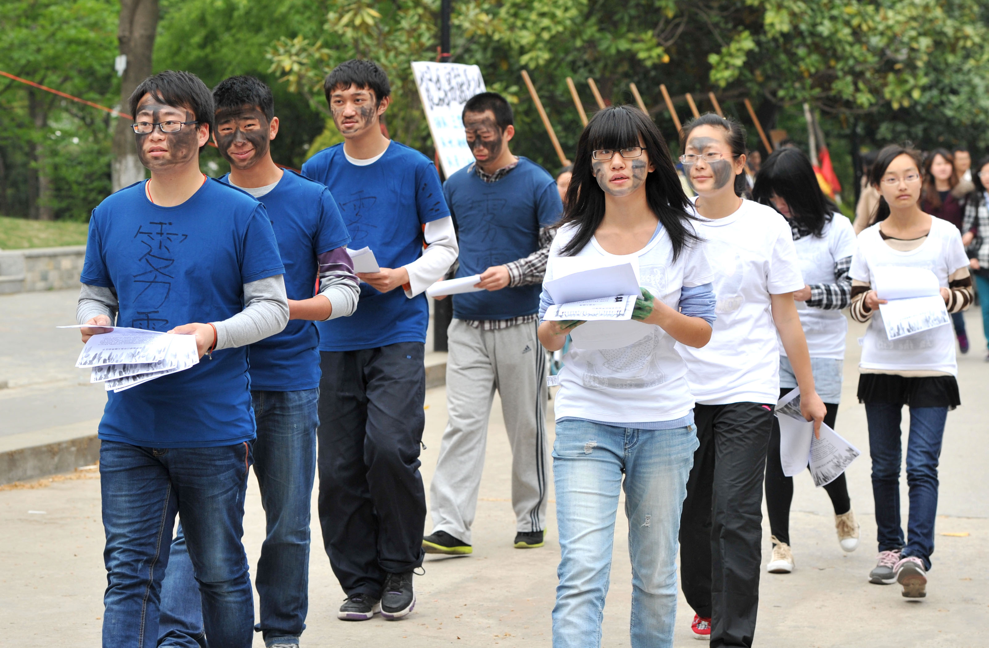 上午十一点,活动正式启动。八名志愿者分别穿着代表天空的蓝色上衣和代表水源的白色上衣,在脸和手臂上彩绘黑色及灰色图案,象征天空充满灰霾、水体已被污染的环境现状。志愿者们行走在教学楼、主楼、图书馆等校园标志性建筑之间,向过往同学发放环保倡议书和宣传单,呼吁大家关注空气污染、水污染等迫在眉睫的环境问题,认识到保护地球、保护环境的重要性。与此同时,资环学院官方微博资环青年也在向全校学生征集“环保先锋”创意勋章图案,并制作成勋章发放给参与校园环保的志愿者,号召大家向身边不环保行为说“NO”,在自身践行环保的同时也积极制止他人破坏环境的行为。参与同学通过“用双手还世界绿树蓝天”、“绿色有我,环保有我”等活动提升环保意识,最终达到保护环境的目的。
