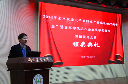 徐国华院长代表学院发言,他首先代表资环学院向获得学院最高奖励的优秀学生和科技工作者表示祝贺,向长期以来关心和支持学院发展的各大企业和资环校友表示衷心感谢。 他指出,在教学科研,人才培养,社会服务等各方面,学院均进入良性发展的轨道,学院需要更多的优秀学生在社会上产生更大的影响力。徐院长呼吁更多的优秀学生积极参与科学研究、出国深造、考取研究生,提高能力,增强在社会中的竞争力,扩大南农大资环学院校友在国际上的影响力。最后,他祝愿同学们在接下来的期末考试中取得优异的成绩。