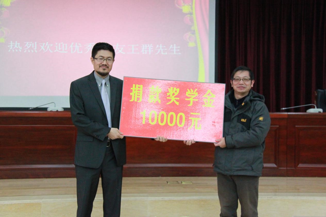 优秀校友王群先生向资环学院捐赠奖学金10000元,并结合自身经历做了报告。王群先生与大家分享了他在加拿大的经历并对资环学院以及参与筹备事宜的老师们表示感谢。他在报告中指出,成功离不开合作,要永远相信成大事需要别人的帮助,要处理好与同学、同事的关系。