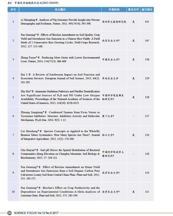 近日,由中国科学院文献情报中心科学计量团队发布的中国热点论文榜中,我校潘根兴教授团队3篇SCI学术论文入选中国农学领域十大热点论文。“热点论文”,顾名思义,即为众人所关注的论文,这种关注度在科学计量学领域可以用论文被引用的次数来量化和测度。该榜单以2012-2016年中国科学家的SCI论文为数据基础,分领域统计了自发表以来被引频次最高的论文,以展现颇具显示度的中国科技成果。本期发布的热点论文榜涉及数学、物理学、化学、生物学、医学、农学、地学、环境科学和工程技术9个领域。