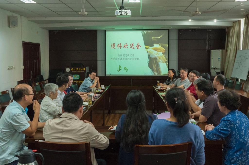 欢送会在欢声笑语中进行,胡忠明老师回忆起从前,讲自己如何与环境专业结缘,又是如何从北师大的本科到南京大学读研再到南农教学。胡忠明老师表示,南农对自己影响很大,南农也是实现自己从小以来教师梦的主要平台。接着胡忠明老师就自己在南农的科研工作、学生工作、教学工作、社会工作四个方面做出总结,他表示,自己在学生工作中基本做到了与同学融洽相处;在教学工作中为资环学院环境专业建立了初具规模的课程体系;在社会工作中不提要求,做事尽力而为。