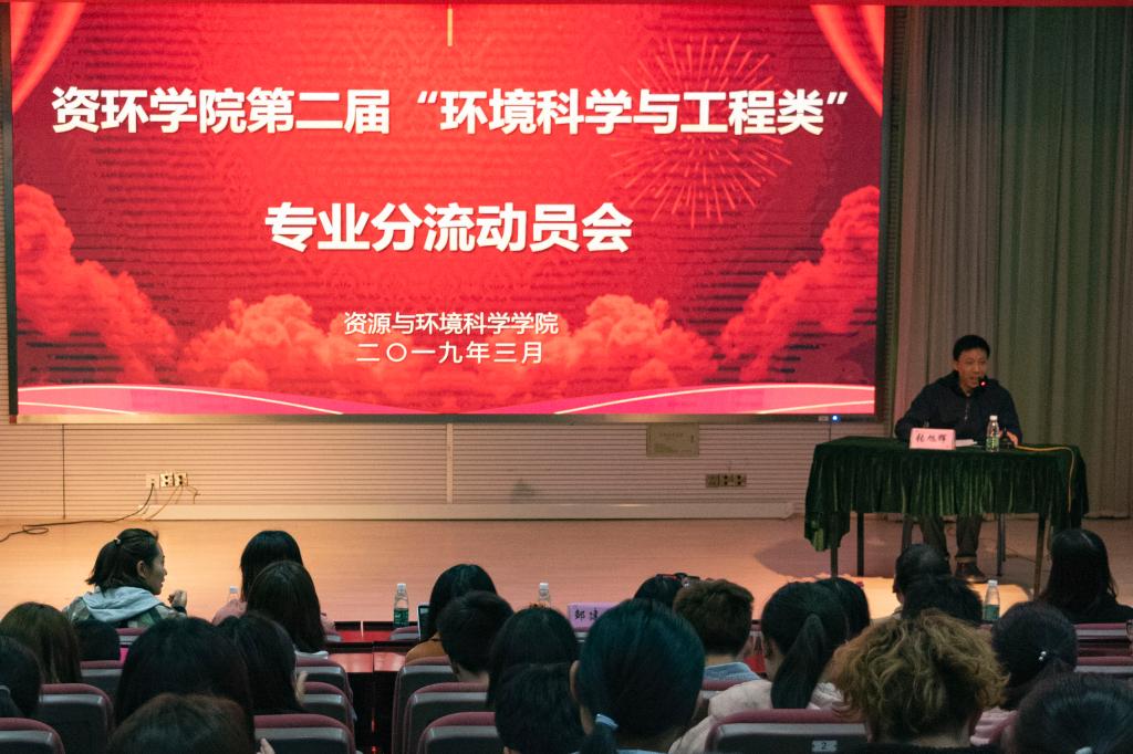 第二届“环境科学与工程类”专业分流动员会在教四楼报告厅举行。资环学院院长邹建文、张旭辉副教授、教务秘书王洪梅、2018级各班班主任以及2018级全体学生参加了本次动员会。此次动员会采用了线上直播的形式与在线学生家长进行适时互动。大会由张旭辉主持。