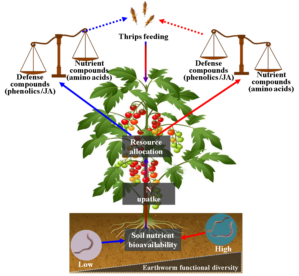 土壤生态课题组发表了题为“Earthworms suppress thrips attack on tomato plants by concomitantly modulating soil properties and plant chemistry”的研究论文。该研究以我国两种典型生态型蚯蚓(内栖息种和深居种)为例,研究其对番茄害虫(西花蓟马)的防御机制。研究发现当蚯蚓物种丰富度低如仅有内栖型蚯蚓时,番茄叶片合成更多防御物质,植物的抗虫性显著增强;而蚯蚓物种丰富度高时,番茄叶片优先分配合成更多的营养物质,植物耐受性增强;说明蚯蚓对植物抗虫性两种作用机制具有此消彼长的关系(如下图)。