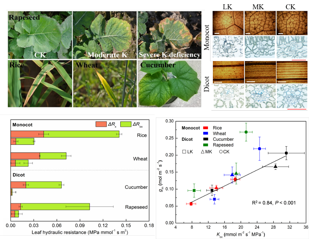 郭世伟教授团队在植物钾素营养生理上的研究进展。本研究通过分析不同缺钾胁迫程度下单子叶作物(水稻和小麦)和双子叶作物(黄瓜、油菜)叶片的水分运输特征,首次证明中长期缺钾显著降低叶片的导水率,其中木质部外水流阻力的增加贡献了60%。且在缺钾胁迫下单子叶和双子叶作物具有两种不同的水力调控策略:双子叶叶片通过降低细叶脉密度来改变水文运输系统,从而减弱叶片的水分运输能力;而单子叶叶片则主要通过降低细叶脉维管束大小而非影响其密度来调控叶片导水率。同时,研究还进一步明确了缺钾时叶片水和CO2传输能力的协同降低主要依赖于叶片木质部外导水率和叶肉层CO2传输能力间良好的耦合关系。该研究从碳水耦合的角度剖析了缺钾叶片叶缘失绿黄化并逐渐演变为焦枯状的发生机制,揭示了单子叶和双子叶作物在缺钾胁迫下的两种不同水力调控策略。对于进一步深入理解营养元素在协调叶片水碳投资和耦合运输上的作用机制有重要意义。
