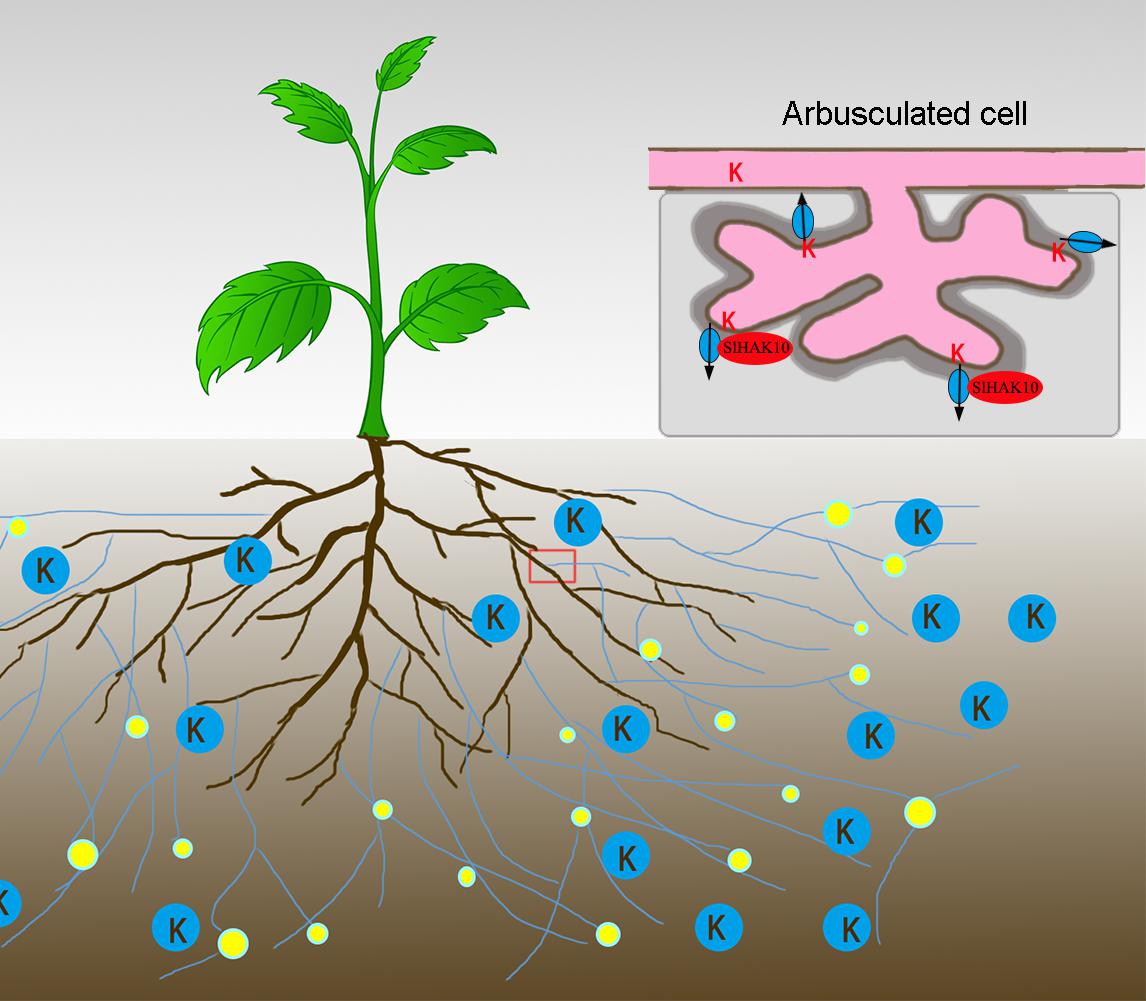 徐国华教授团队在Plant Physiology在线发表了题为“The Potassium Transporter SlHAK10 Is Involved in Mycorrhizal Potassium Uptake”的研究论文。该研究证明了接种AM真菌Rhizophagus irregularis能够显著提高番茄体内钾含量,而低钾胁迫对番茄菌根共生具有负效应。该团队通过转录组数据库分析,从番茄中鉴定到唯一一个受菌根共生诱导的钾转运体基因SlHAK10。该基因在被菌丝侵染形成丛枝的细胞中特异表达。突变该基因显著降低菌根途径钾吸收,并在低钾胁迫条件下抑制可溶性糖在根中积累,从而不利于菌根共生。将SlHAK10在番茄中超表达能够显著增强低钾胁迫条件下植株对钾的吸收能力,并提高根系可溶性糖含量,提高菌根共生效率。该研究首次证实了在番茄中存在着一条以SlHAK10为介导的菌根钾吸收途径,为今后深入研究菌根共生与植物钾营养之间的互作机制提供了理论基础。