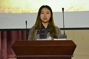 环工161班翟丁萱作为新生代表发言,她引用了孔子和曾子的话来谈了自己对于民族精神的理解,认为应该将个人命运与祖国的命运联系起来,响应时代召唤,弘扬民族精神。
