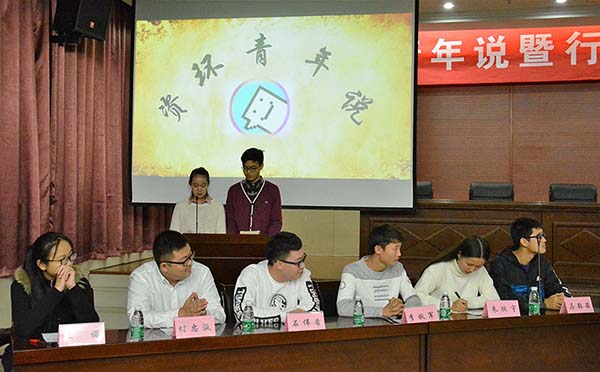 大会共分为四个部分:民族精神主题视频展示,“资环青年说”,新生代表发言,总结发言。