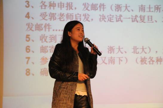 首先讲话的是生态111的李强同学,她被保研至山东大学。她向大家详细地介绍了“保研申请条件”、“综合成绩计算”、“综合素质能力”以及“2015年免试推荐”四个保研相关知识。在浅谈了个人经历及感悟之后,她用一句“不患无位,患所以立”告诉大家:只要我们变成了人才我们就能找到属于自己的位置。最后她将“锦上添花”四个字送给现场观众,希望大家不是抹布,也不要从锦变成抹布,如果是锦就要懂得如何往上添花。
