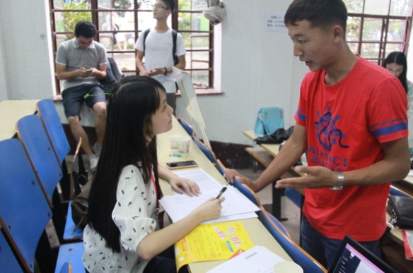 主楼101室,一群头戴“绿豆芽”发卡的资环学院志愿者们正在忙碌地进行着2015级新生的迎新工作。