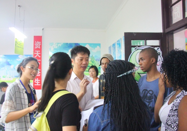9月5日上午9:00,资环学院院长徐国华,院党委书记李辉信,副院长李荣,副书记崔春红以及办公室主任张军前来视察迎新工作。徐国华院长,崔春红书记亲切地与前来报道的留学生新生交谈。