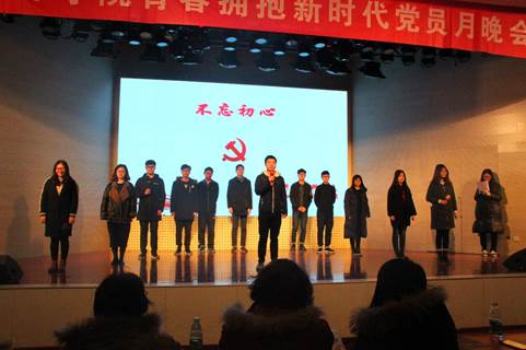 于2017年12月17日晚在大学生活动中心召开“青春拥抱新时代”党员月晚会。资环学院党委副书记崔春红老师、院办公室主任张军老师、党务秘书巢玲老师、院关工委孙进老师、张红娣老师、王汝慧老师作为嘉宾出席了此次晚会。