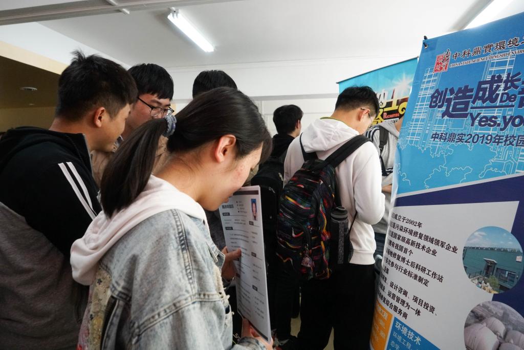 招聘现场人头攒动,气氛活跃,许多大三大四的学生和研究生前来咨询与投递简历。各单位通过展板展示、现场咨询、发放招聘简章、关注微信公众号等方式向同学们进行企业招聘的介绍与先关问题的解答。一名环境科学专业的应聘者说:“通过今天的咨询,发现环保类的工作对工作经验的要求较高,所以在学习期间还是应当多参加实习,注重实践技能的培养。”另一名研究生同学表达了类似的观点。