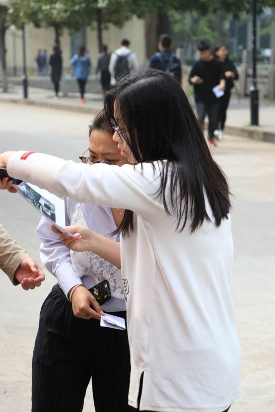 第二关卡——“横看成岭侧成峰”。回到起点的小组依据第一关抽到的序号领取对应照片线索,选手找到图中地点并于同一角度拍摄照片认证,这考验了同学们对学校的熟悉程度。“幸运”的同学抽到经常经过地“高频”地点,但抽到不熟悉区域的同学就需花费更多时间去寻找。