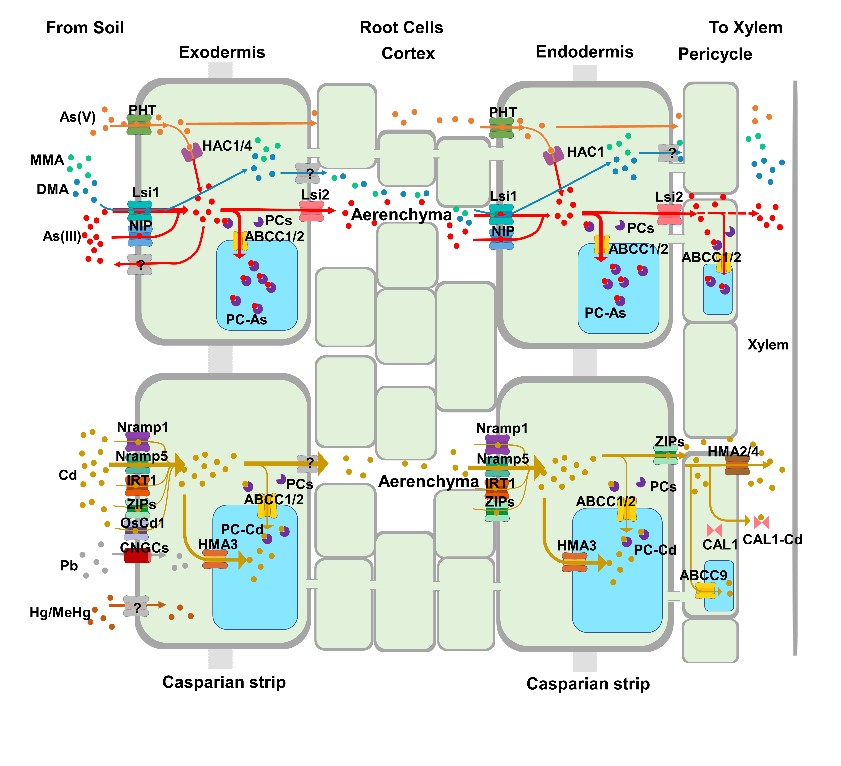 本文首先介绍这些有毒金属元素在农产品尤其是稻米中存在的化学形态和分布,不同化学形态对人体的毒性迥异。文章接着介绍植物吸收和转运有毒金属的分子机制及调控机理,由于物理化学性质相似的缘故,这些有毒金属元素可搭载一些植物必需营养元素吸收转运蛋白的便车进入细胞中。砷、镉、铅、汞都是所谓的亲硫元素,容易被富含巯基的多肽如植物螯合素络合,将这些有毒金属的络合物或未被络合的离子转运进入液泡进行区隔化,是植物解毒这些有毒元素的重要机制,也是限制其向作物可食部位转运的关键步骤。