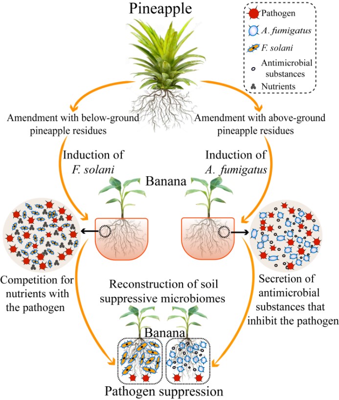 沈其荣教授“土壤微生物与有机肥团队”的最新研究成果,“Development of fungal-mediated soil suppressiveness againstFusariumwilt disease via plant residue manipulation”。该研究发现,香蕉连作土壤中添加菠萝残体能有效降低香蕉土传枯萎病发病率,真菌群落组成的改变介导了病害抑制作用的形成;其中,添加的菠萝残体改变了土壤真菌群落组成,并诱导了关键真菌烟曲霉(Aspergillus fumigatus)和茄病镰刀菌(Fusarium solani)丰度的增加,其分别通过拮抗作用和营养竞争直接和间接抑制病原菌。本研究同时发现茄病镰刀菌(非香蕉枯萎病病原菌)在土壤中大量富集,通过同属竞争作用抑制尖孢镰刀菌(香蕉枯萎病病原菌),这给香蕉土传枯萎病的生物防控提供了新的思路。