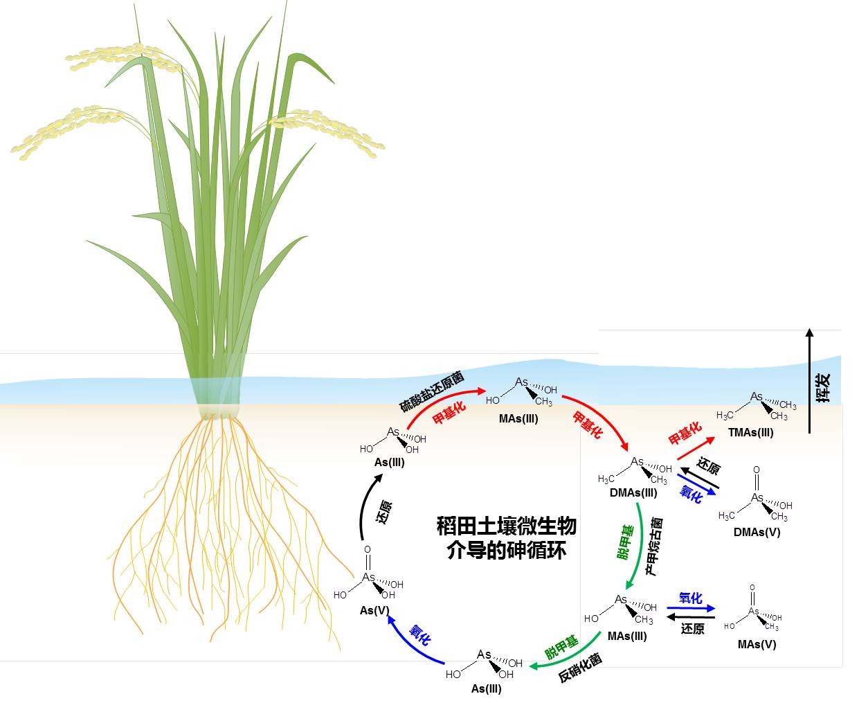 图1. 微生物介导的稻田土壤砷甲基化与脱甲基过程