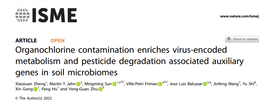 胡锋教授团队的最新研究成果《Organochlorine contamination enriches virus-encoded metabolism and pesticide degradation associated auxiliary genes in soil microbiomes》。该研究通过宏基因组和宏病毒组测序技术研究了噬菌体编码的辅助代谢基因在有机氯农药污染土壤中的富集机制。随着农药胁迫的升高,噬菌体群落编码与农药降解的辅助代谢基因的多样性及丰度显著增加。通过基因合成与表达试验验证病毒编码的L-2-卤酸脱卤酶基因 (L-2-haloacid dehalogenase gene, L-DEX) 具备降解 L-2-卤酸农药前体的能力,从而在亚抑制农药浓度下改善细菌生长。研究结果为探明病毒群落协助宿主抵御土壤中农药污染逆境胁迫的过程与机制提供了新的科学认知。