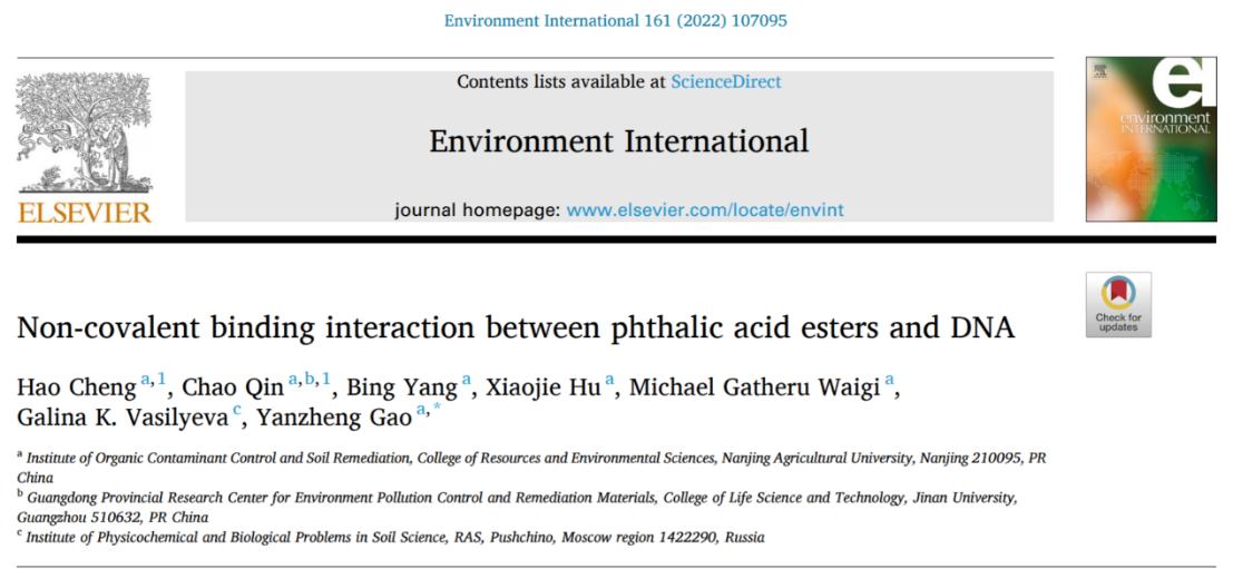 研究生程浩和秦超博士为论文共同第一作者,高彦征教授为通讯作者,俄罗斯科学院土壤理化与生物问题研究所Galina K. Vasilyeva教授等参与了该研究。高彦征教授课题组近年来围绕水土环境中有毒有机物与生物大分子互作关系及其分子生态效应,在有毒有机物影响的DNA界面行为、酶解过程、基因水平转移等方面开展系统研究,相关成果发表在Environmental Science & Technology、Water Research、Environment International、科学通报等期刊上。