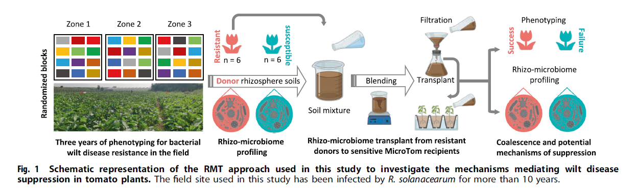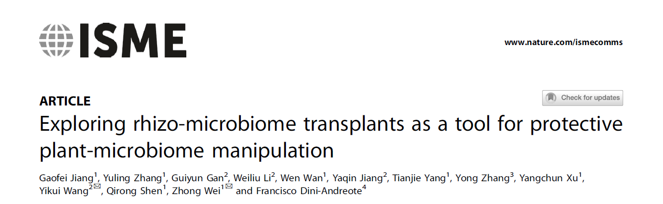 2022年2月1日虎年大年初一,Nature子刊《ISME Communications》在线发表南农大资环学院沈其荣院士团队LorMe实验室的最新研究成果《Exploring rhizo-microbiome transplants as a tool for protective plant-microbiome manipulation》。该研究通过田间原位试验、根际微生物组分析和宏培养学等研究,揭示“根际菌群移植”增强作物抵御土传青枯菌生物障碍的根际微生态过程与机制。研究发现,供体和受体植物根际菌群的匹配性与核心有益菌的定殖能力是移植成败的关键。该研究为根际免疫的定向提升提供了新思路,为土壤生物障碍的消减提供了新的技术手段。