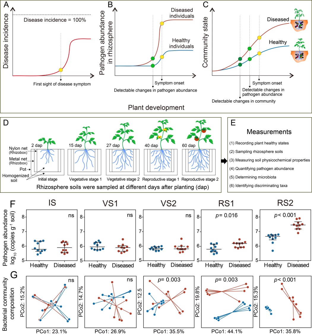 (A-C)研究假说;(D-E)试验设计;(F)病原菌丰度时间动态变化;(G)根际细菌群落动态变化