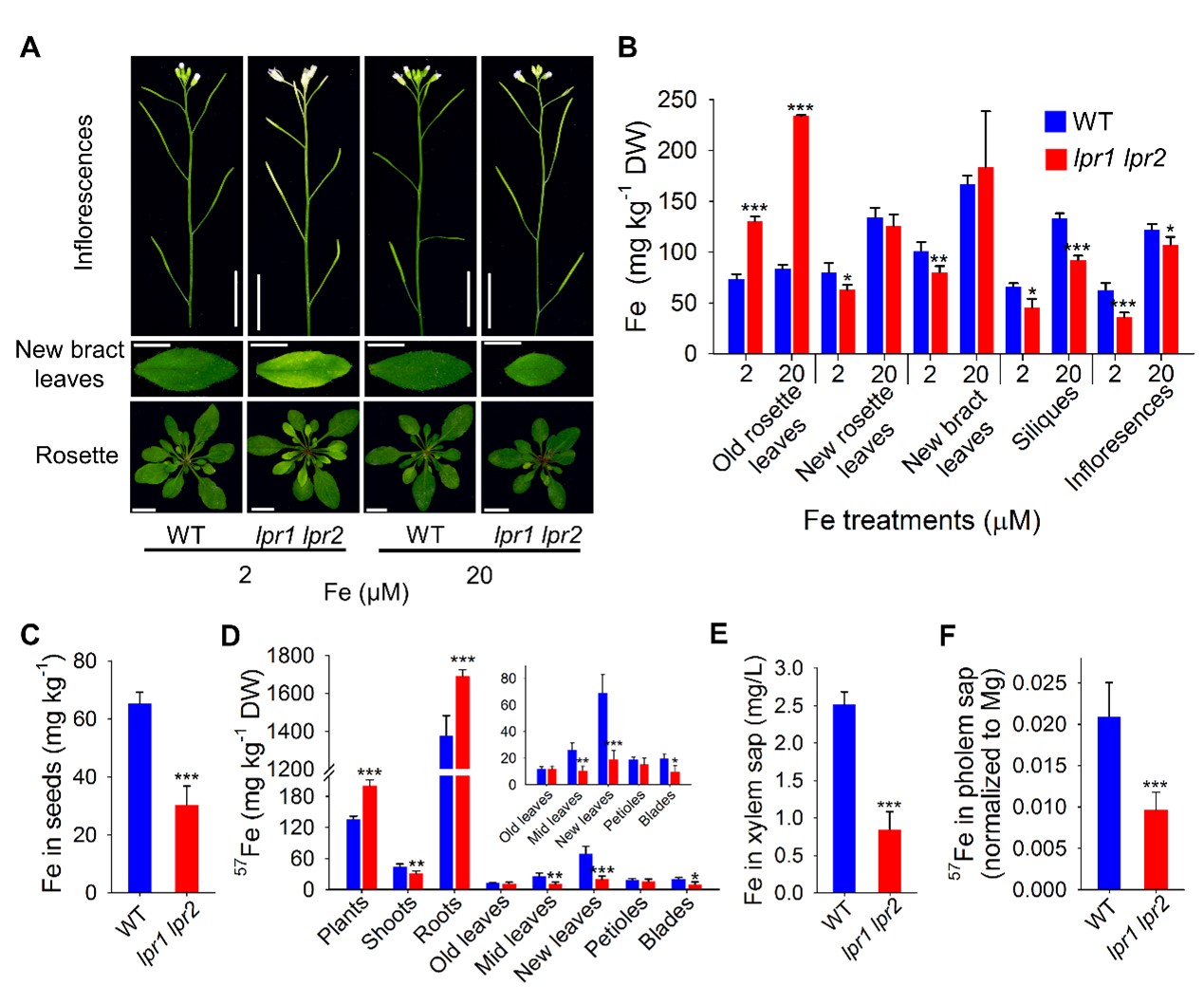 图2. LPR1和LPR2双敲除影响了木质部中铁的转运及铁向新生组织中的分配。(A,B)不同水平铁供应下,WT和lpr1 lpr2各器官的黄化表型(A)和铁含量(B);(C)低铁(2 μM)供应条件下,WT和lpr1 lpr2种子中铁含量;(D)57Fe在拟南芥各器官中的分配;(E)木质部汁液铁浓度;(F)韧皮部汁液相对铁含量。