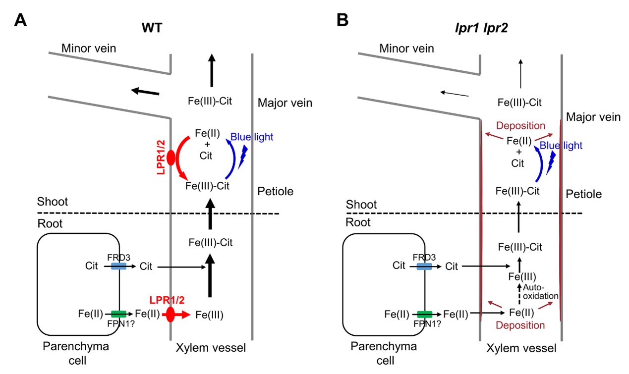 图3. LPR1和LPR2参与木质部铁转运的分子机制示意图。(A)野生型;(B)lpr1 lpr2双突变体。红色箭号代表LPR1/LPR2介导的Fe(II)氧化,蓝色箭号代表Fe(III)-柠檬酸的光还原,棕色箭号代表Fe(II)在细胞壁的沉积。