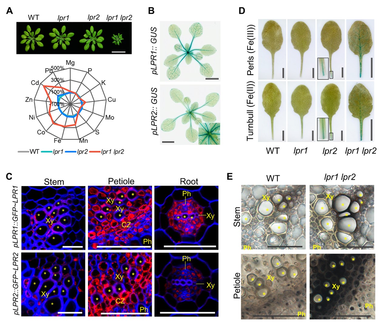 图1.(A)突变体lpr1 lpr2地上部生长表型和离子组分析;(B)LPR1和LPR2在拟南芥地上部的表达模式;(C)维管束中LPR1和LPR2的亚细胞定位;(D)突变体lpr1 lpr2叶片中铁的沉积(蓝色);(E)突变体lpr1 lpr2茎和叶柄切片中铁的分布(黑色)。