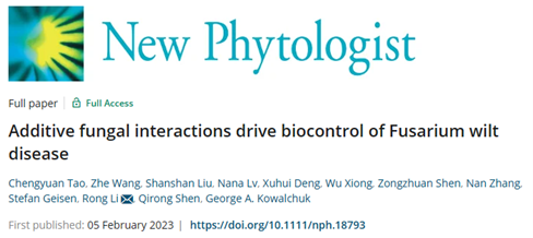 2月28日,植物学领域国际权威期刊《New Phytologist》正式在线发表了沈其荣院士团队在利用木霉生物有机肥防控农作物土传枯萎病机理研究方面的最新成果:“Additive fungal interactions drive biocontrol of Fusarium wilt disease”。该成果揭示了益生木霉NJAU4742通过激活有益真菌互作过程,与土著益生真菌协同抑制病原真菌侵染作物根系,防控香蕉土传枯萎病发生的作用机制,为利用施肥靶向激活土壤抑病功能提供了理论借鉴。