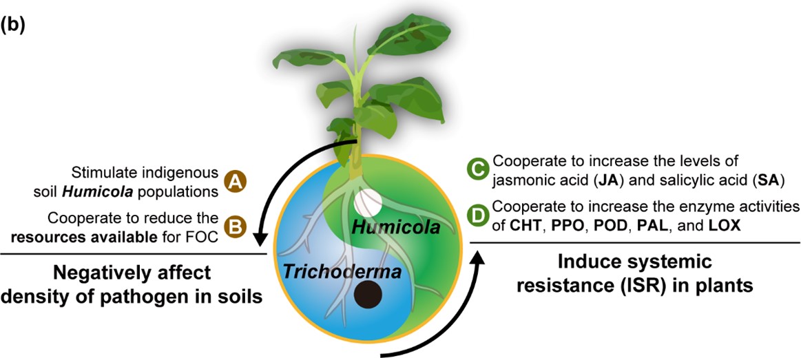 由病原真菌导致的植物病害严重威胁我国农业绿色可持续发展,研究表明,微生物在抑制植物病害方面发挥着至关重要的作用,因此,解析利用有益微生物调控抑病型土壤微生物群落形成的具体机制是开发利用土壤微生物保护农作物健康生长的重要途径。团队前期研究发现,通过生物有机肥将特定益生菌引入病害土壤可有效抑制土传病害的发生,然而,决定益生菌应用成功的微生物生态学机制依然不明。本研究基于木霉生物有机肥调控高发土传病害土壤试验,联合高通量测序、可培养真菌组构建、真菌回接与互作等技术研究发现,土壤抑病能力的激活与木霉诱导的真菌群落组成变化密切相关。进一步研究发现,木霉能够与土著腐质霉形成有效抵御病原菌侵染植物的益生“菌团”,该“菌团”通过协同作用竞争病原真菌的生存资源,并诱导植物系统抗性,从而增强真菌群落对宿主植物的保护作用。