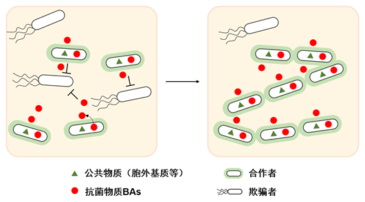 如同人类社会一样,微生物群体内部具有明确而细致的劳动分工,不同的细胞亚群负责执行不同的任务且彼此相互合作。产生并共享的“公共物品(public goods)”是微生物维持群体稳定的关键因素,但是微生物群体中会出现不产生但只利用群体“公共物品”的“欺骗者(cheater)”,不劳而获的“欺骗者”由于不需要额外耗能生产“公共物品”而在群体中具有生长优势,如果“欺骗者”逐渐增多,将导致群体崩溃。所以,微生物群体发展出惩罚“欺骗者”的机制以维护群体稳定。