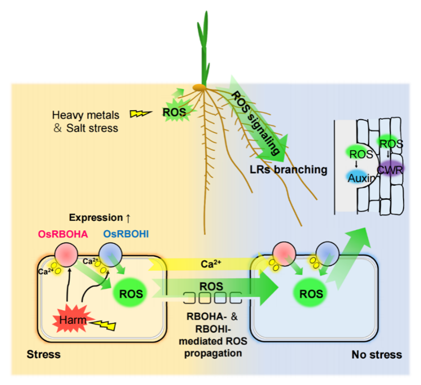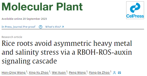 赵方杰教授团队题为“Rice roots avoid asymmetric heavy metal and salinity stress via a RBOH-ROS-auxin signaling cascade”的研究论文,揭示了水稻根系通过呼吸氧爆发同源酶-活性氧-生长素(RBOH-ROS-Auxin)的信号通路,重塑根系构型以规避局部的重金属和盐胁迫。