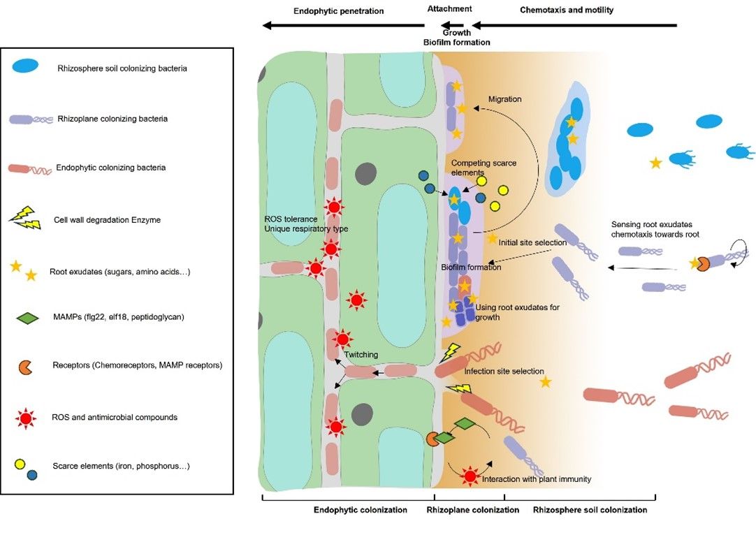 该文以植物益生菌的根际定殖过程为线索,从根际的趋化运动、根表黏附、根表生物膜形成和内生化这四个方面详细总结了其中涉及的细菌信号感知和微生物分子调控途径,并讨论了根系分泌物和植物免疫对根际定殖的影响及作用机理。该文还总结了“呼救”反应对根际益生菌定殖的促进作用,详细比较了根际益生菌与植物土传病原菌和植物共生菌根际定殖过程的异同,文章最后提出了增强植物益生菌根际定殖能力的调控和驯化策略。