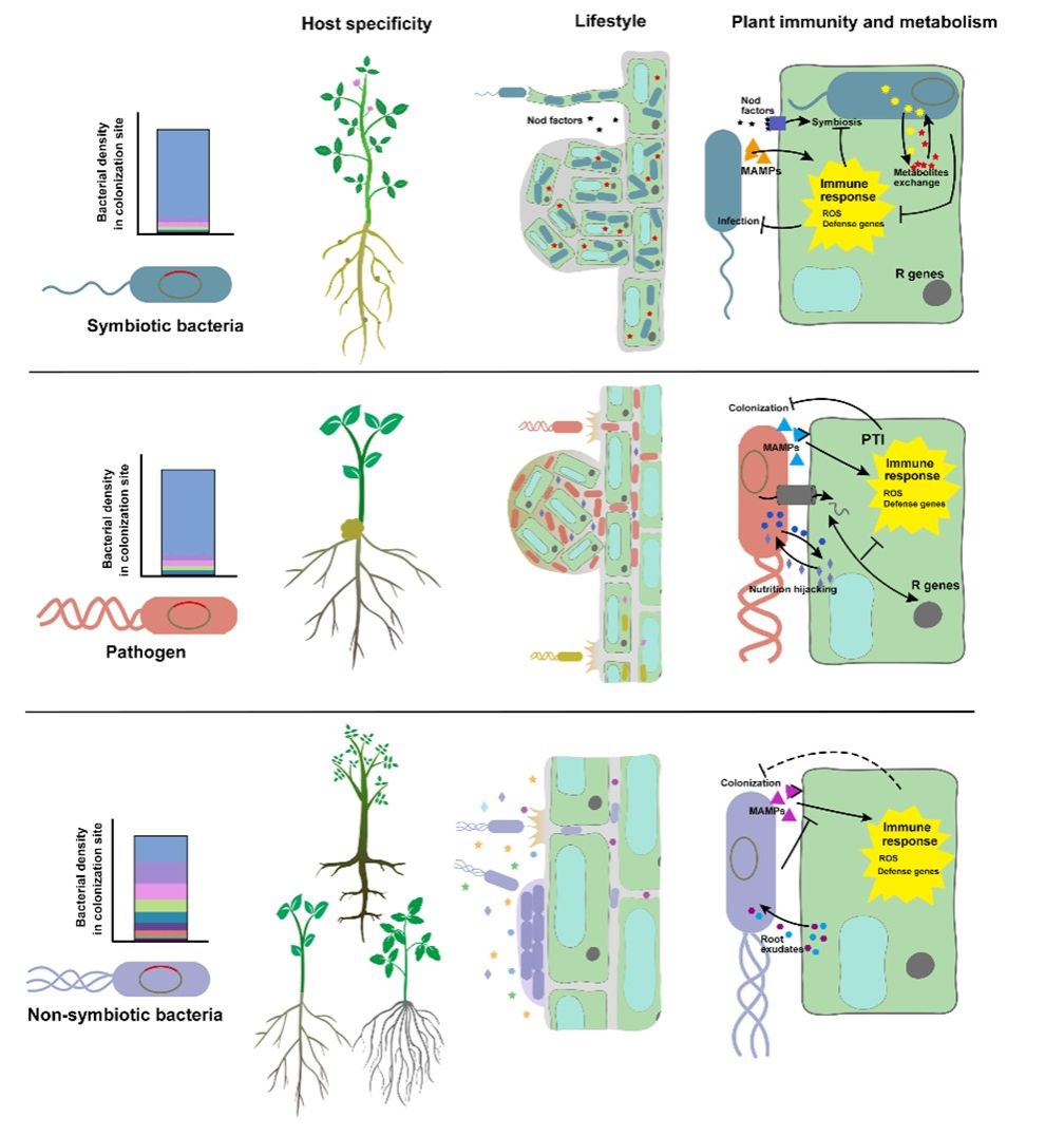 图2 非共生益生微生物与植物病原菌和共生菌的根际定殖异同