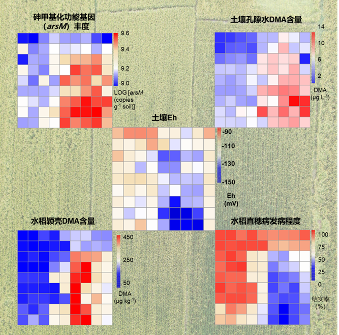 图2. 田块尺度水稻“直穗病”、颖壳DMA含量、土壤Eh、arsM基因丰度、土壤孔隙水DMA含量的空间变异密切关联