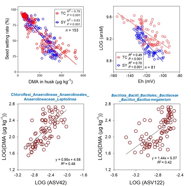 图3.水稻颖壳DMA含量与结实率、arsM基因丰度与土壤Eh的相关性,与水稻颖壳DMA含量显著相关的土壤细菌(ASV)。TC:郯城;SY:泗阳