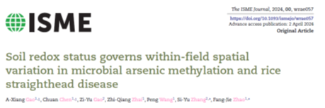 近日,赵方杰教授团队与华东师范大学张思宇研究员团队在《The ISME Journal》发表了“Soil redox status governs within-field spatial variations of microbial arsenic methylation and rice straighthead disease”文章,发现田块尺度土壤氧化还原电位(Eh)的变异通过影响土壤微生物砷甲基化造成水稻“直穗病”的空间变异。