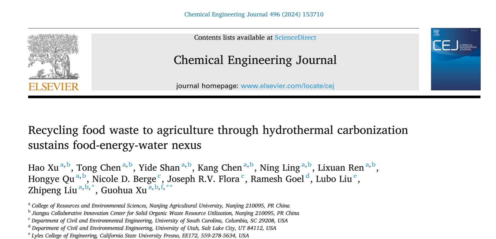 团队在化工、环境领域的传统顶刊《Chemical Engineering Journal》杂志(IF 13.3)上发表了题为“Recycling food waste to agriculture through hydrothermal carbonization sustains food-energy-water nexus”的研究论文。资环学院博士毕业生徐昊为该论文的第一作者,刘志鹏副教授和徐国华教授为通讯作者。资环学院凌宁教授和任丽轩副教授、美国南卡罗莱纳州立大学Nicole Berge 和Joseph Flora教授、犹他大学Ramesh Goel教授、加州州立大学弗雷斯诺分校刘绿波教授等参与了该项研究。