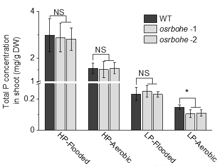图2. 根毛对水稻磷获取(地上部总磷浓度)的影响。