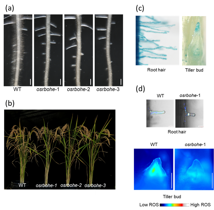 图1. OsRBOHE影响水稻根毛形成和分蘖。敲除OsRBOHE 基因减少根毛形成 (a) 和分蘖(b);(c)OsRBOHE启动子-GUS显示OsRBOHE在根毛和分蘖芽表达;(d)敲除OsRBOHE 基因减少根毛和分蘖芽中活性氧(ROS)产生。