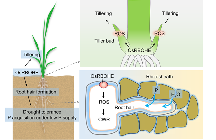 近日,Plant Cell & Environment在线发表了赵方杰教授团队题为“The Respiratory Burst Oxidase Homologue OsRBOHE is crucial for root hair formation, drought resistance and tillering in rice”的研究论文。该研究揭示了水稻呼吸爆发氧化酶同源物OsRBOHE在水稻根毛形成、抗旱和分蘖中的重要作用,并揭示了水稻根毛在磷获取的局限性作用。