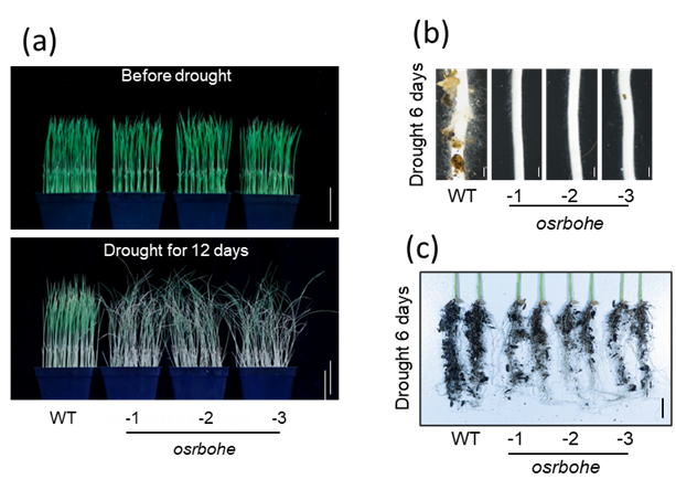 图3. 根毛在水稻抗旱中的作用。(a)干旱处理前后野生型和OsRBOHE敲除突变体生长表型;干旱处理6天后根毛(b)和根鞘(c)表型。