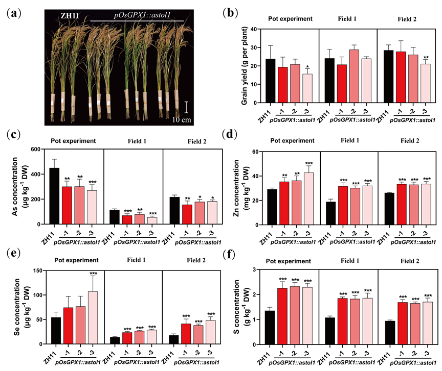 图2 三种试验条件下表达pOsGPX1::astol1对水稻生长和籽粒元素含量的影响。(a) 野生型(ZH11)和pOsGPX1::astol1株系在田间试验的植株表型,(b) 单株籽粒产量;(c-f) 糙米中总As (c)、Zn (d)、Se (e)和S (f)的含量。
