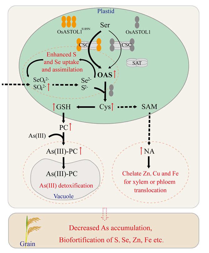 该实验室先前的研究中发现了一个水稻质体定位的O-乙酰丝氨酸(硫醇)裂解酶(OAS-TL)突变等位基因(astol1),其编码蛋白第189位氨基酸由丝氨酸突变为天冬酰胺(OsASTOL1S189N),该蛋白通过增强半胱氨酸合酶复合体(CSC)的稳定性,从而增强半胱氨酸(Cys)的生物合成(Sun et al., 2021)。突变体对砷的耐性增强,而籽粒砷积累减少。然而由于纯合突变体Cys的过度积累,导致生长受抑制,而杂合突变体在田间条件下生长正常,表明astol1的剂量效应需要与野生型等位基因相平衡。在本研究中,为了实现astol1增强Cys生物合成的潜力,同时克服其对水稻生长的抑制,采用了一个中等表达水平的线粒体谷胱甘肽过氧化物酶基因(OsGPX1)的启动子来驱动astol1在野生型水稻中的表达。一系列的实验结果表明,表达pOsGPX1::astol1可显著促进硫的吸收和同化,根系中硫酸盐转运蛋白基因OsSULTR1;1和OsSULTR2;1表达水平升高,硫酸盐含量增加,Cys合成的限速酶SAT活性显著增强,O-乙酰丝氨酸(OAS)、Cys、谷胱甘肽(GSH)、植物螯合素(PCs)含量增加,耐砷能力增强。此外,根系中烟酰胺(NA)合成关键基因OsNAS的表达水平显著提高,NA含量升高(图1)。NA是微量元素Zn、Fe、Cu的螯合物,对植物体内这些元素向籽粒转运起重要作用。